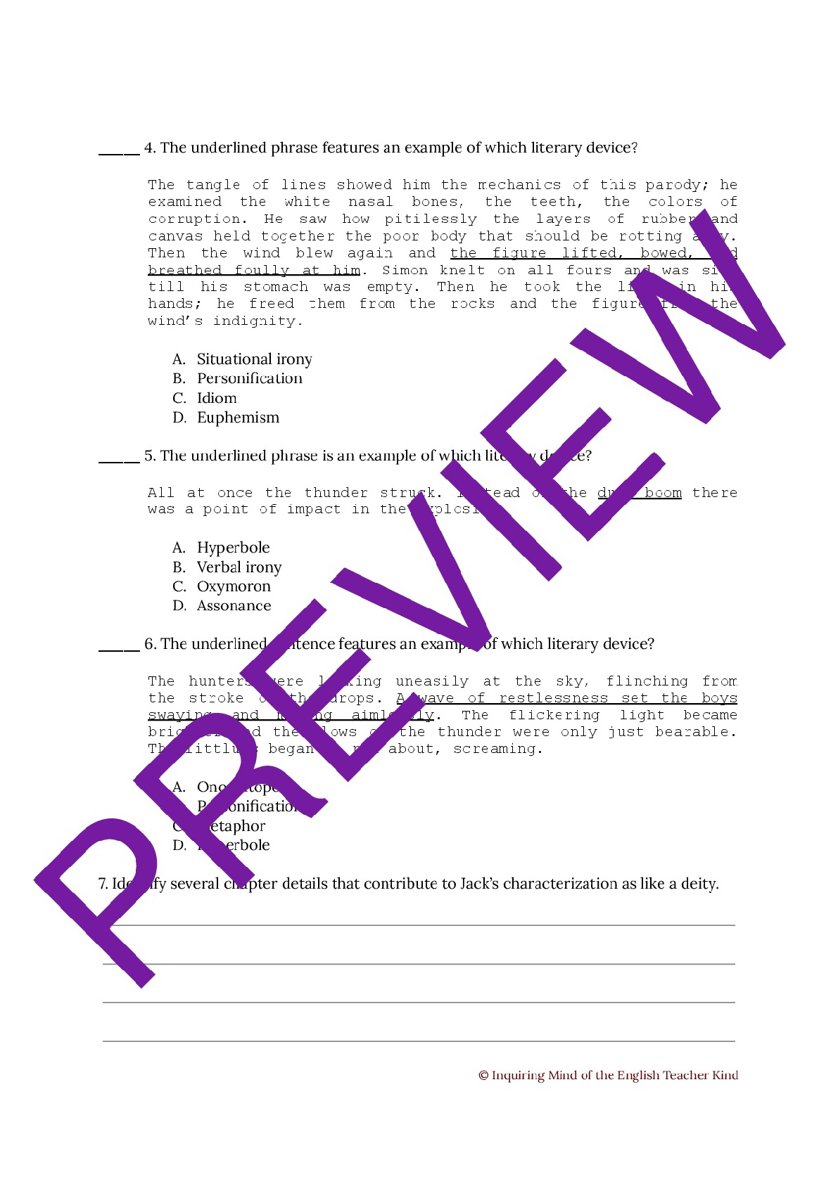 Lord Of The Flies Close Reading Worksheet Ch 9 Teaching Resources